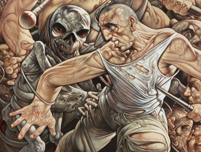Luxuria (2018) visualises a densely populated world in decline, depicting figures engaged in a struggle for survival. Howson constructs a compelling narrative that delves into themes of conflict, destruction, human suffering, and redemption. Often drawing on Latin phrases for the titles of his artworks and exhibitions, Luxuria translates to a state characterised by excess and extravagance.