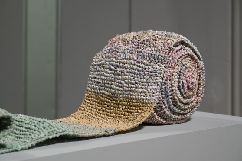Beyond the Surface is a deeply personal exploration of human identity and connection. It begins with Chen collecting expired passports in person from people willing to share them and offer their individual stories. Chen describes this process as representative of "our human need - this pure love, not an identity of paper." She shreds the passports, deconstructing the individual identity, and knits the strands together, intertwined with the passports of others, (re)constructing one large interconnected body.