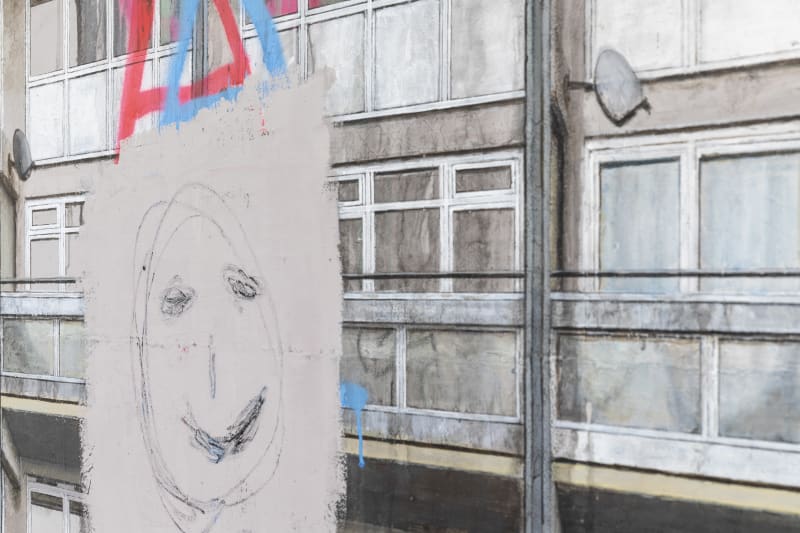 On a monumental scale and often across multiple panels, Hepher replicates a builder's application of textured and deteriorated facades, pushing the paintings to the brink of abstraction. Pours of paint, drips, staining, and graffiti disrupt the ordered geometry of the structures and reflect increasing physical and social changes of the buildings themselves.