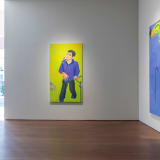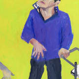 With a Handicap Like Yours... (2018) shows Lucy Jones standing within a bright yellow canvas, leaning upon her walker. Using complementary colours of purple, visible on the artist’s jumper and her shoes, which are placed against the yellow background, Jones creates a highly contrasted and vibrant image.