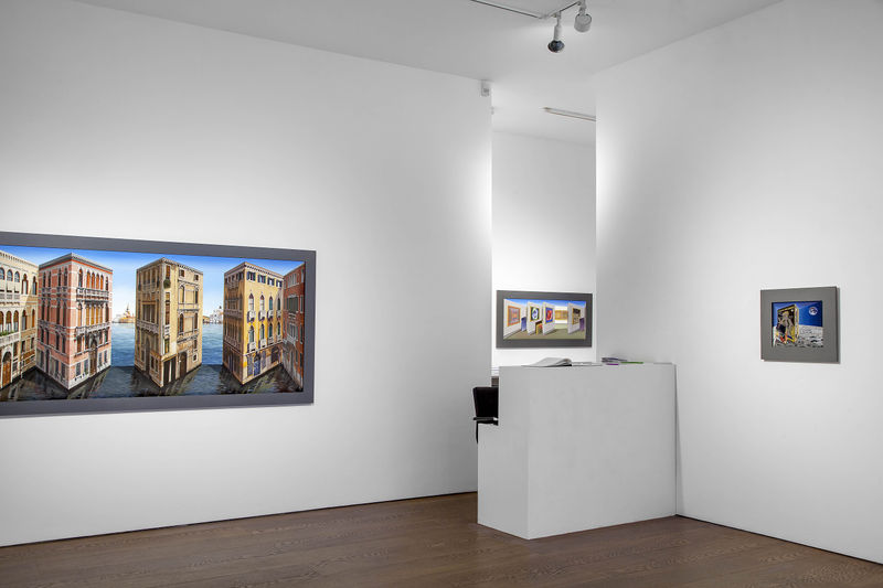 Stairs to the Stars is constructed from a succession of horizontal trapezoids portraying a perspectival view of a staircase, inviting the viewer to enter the scene while also making reference to the visual conundrums of Escher’s ‘impossible’ constructions. Alluding to what could be at stake in our visual unpacking of reality, the title of a new multifaceted painting Light is the Shadow of God derives from a quote by Sir Thomas Browne in his essay The Garden of Cyrus (1658) “The sun itself is but the dark simulacrum and light but the shadow of God.” In this painting, Hughes acknowledges the importance of light in the works of Giorgio de Chirico, Edward Hopper and René Magritte. A more playful approach to Hughes’ perceptual enquiry can be located within the painting Smoking Spaceman, in which the viewer is presented with an image of a popular child’s toy alongside its own painted likeness on the box. Alongside the new subject matter, Hughes returns to several longrunning themes, including the cityscape of Venice, with its enduring ‘pop’ appeal - being, as he has determined, both endlessly reproduced and reproducible.