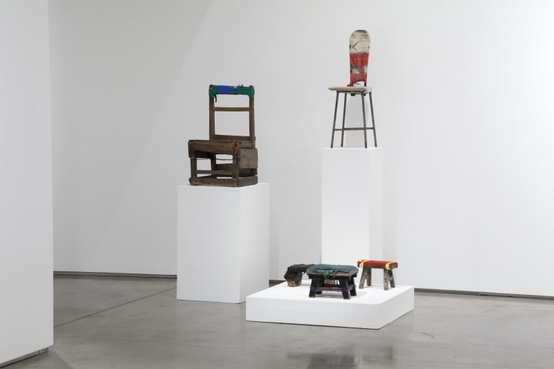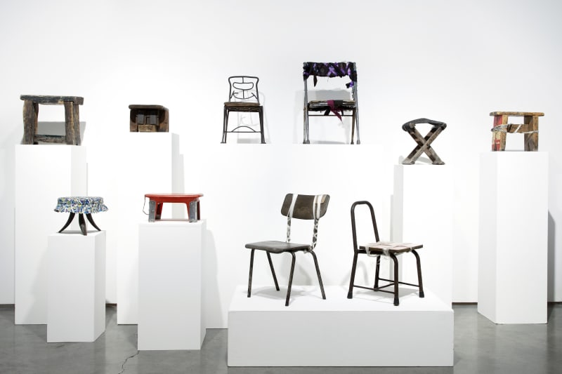 Wolf has returned to particular sites as many as twenty times to capture shifting arrangements, evoking the practice of an urban anthropologist. Distilled from an archive of thousands of photographs, which form a larger ongoing encyclopedic project, Wolf has organised groups of images into typologies, according to formal principles such as colour, rhythm, structure or shape. Gathering objects as well as taking photographs, Wolf has amassed a collection of makeshift seating arrangements found in the alleyways of Hong Kong and mainland China, titled ‘Bastard Chairs’. Typically comprised of fragments of broken seating, they are bound with fabric, plastic and string - balanced, propped and supported by appendages of salvaged material.