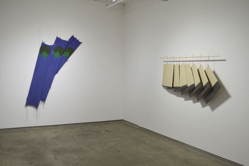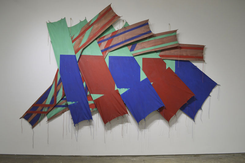 Smith’s Kite Paintings, first exhibited in New York in 1971, can be seen as a development of his freestanding installation ‘Gazebo’ exhibited at the Architectural League of New York in 1966, and a tent project at the Aspen Design Conference of the same year. Both were painted environments constructed from suspended canvas panels, which allowed the viewer to examine their forms from multiple aspects. The Kites continued Smith’s investigations into the detachment of the canvas from the stretcher, while asserting his primary concerns with painting rather than sculpture. The spatial relationships are defined through a rhythmic overlapping of planes and serial arrangements of squares, rectangles, and curved shapes, forming crosses, zigzags and arcs.