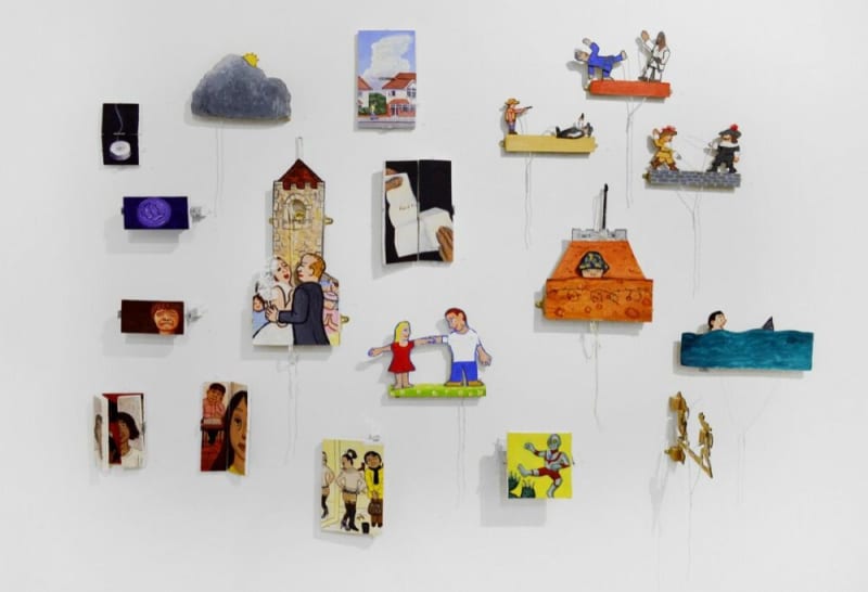 For the visitor to the exhibition however, the show promises to be a fully participatory experience. Some of the works play with the implied space between the viewer and the painting. Others are interactive - hinged panels and strings unfold mini-narratives such as a gunfight, a coin flip, or the peeling of a banana. By manipulating the space both inside and outside the painting, Osuga invites the viewer to enter the scene as a player in his theatre.