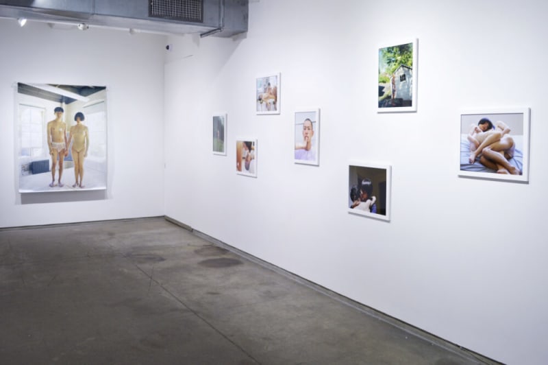 Pixy Liao’s Experimental Relationship navigates the dynamics of power within partnerships between men and women. As a woman brought up in China, Liao describes the perception of an ideal male partner as being older and more mature, playing an authoritative role of protector and mentor. Since meeting her current partner, Moro, who is five years younger, Liao has begun to experiment with alternative possibilities, interweaving a fictional narrative in a series of constructed self-portraits. Photographed within domestic or pastoral scenes, the couple are often locked in embrace with the male body unclothed. The artist uses her body to grip, shield, or brace the male figure, accentuating the shifting balance of their relationship.