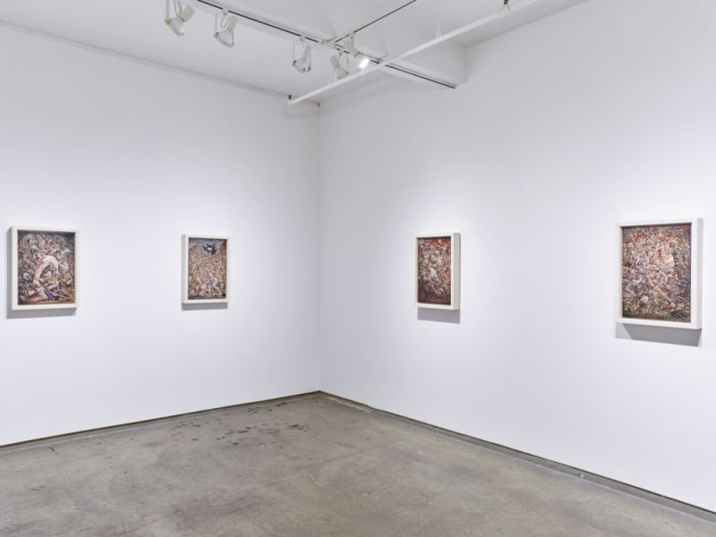 The large painting Prophecy, which lends the exhibition its title, portrays a mob gathering in a dense and tumultuous throng around the central figure of Christ on the cross, surrounded by the desecrated remains of religious symbols and mythological beings. Half naked, or dressed in rags, they brandish torches and wave flags, engaging in seemingly mindless acts of violence or gesticulating in despair. Inspired in part by the abject inhabitants of the waiting room in Canto III of Dante’s Inferno (observed by Dante and his guide Virgil as the ‘sorry souls of those who lived without disgrace and without praise’), these characters appear to move with zombie-like compliance and ambiguous collective purpose.