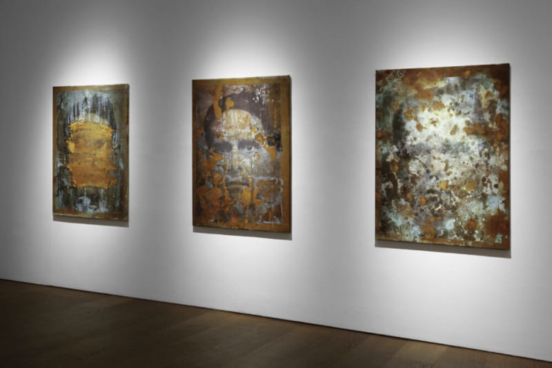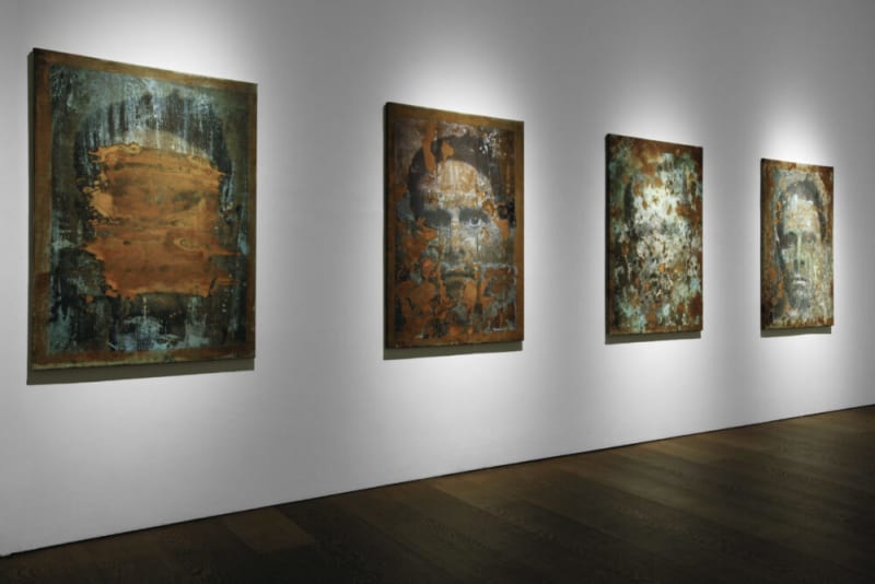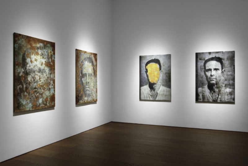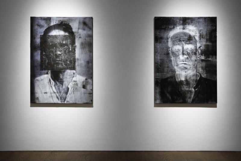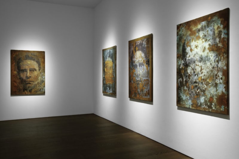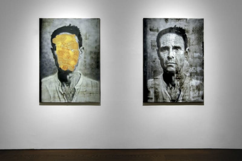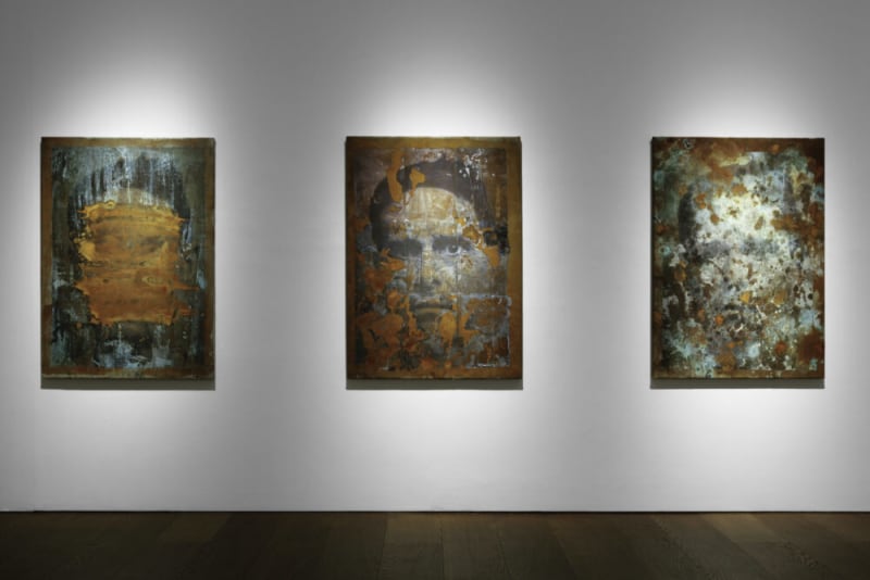 Over recent years, this particular self-portrait has become a recurring motif, forming the material for both an existential meditation and a period of painterly exploration spanning close to fifty works. Altering the painted or printed portrait using chemical processes, Keane has engaged with the tension between the image and its material substance, allowing the materials to play an active role in determining the image, while retaining the vestiges of its original meaning.