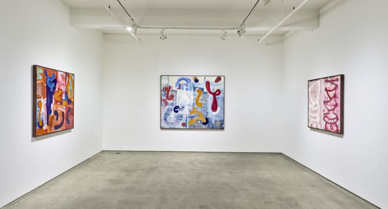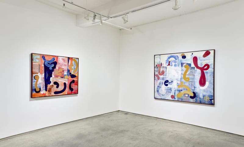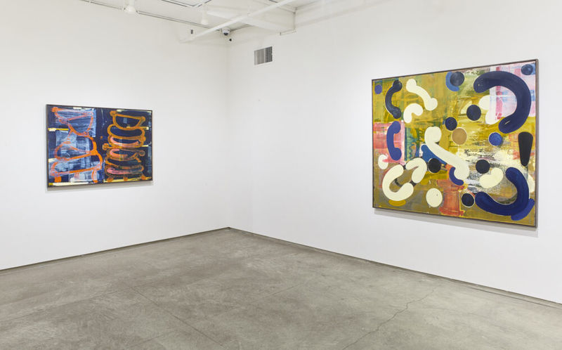 The paintings in the current exhibition represent Blacklock’s pursuit of what he has termed “the beauty of release; the joy of a kind of imagined freedom… of who you are behind closed doors.” Blacklock compares his vigorous and intuitive working process to the acts of dancing or singing, a kinesthetic approach to painting where innate bodily knowledge is glimpsed through the act of making. The curvilinear shapes created by the sweep of the artist’s brush or metal scraper across the surface of the canvas provide a record of the figure in movement, arranging the pictorial space of the painting in accordance with the physical gestures of the body.