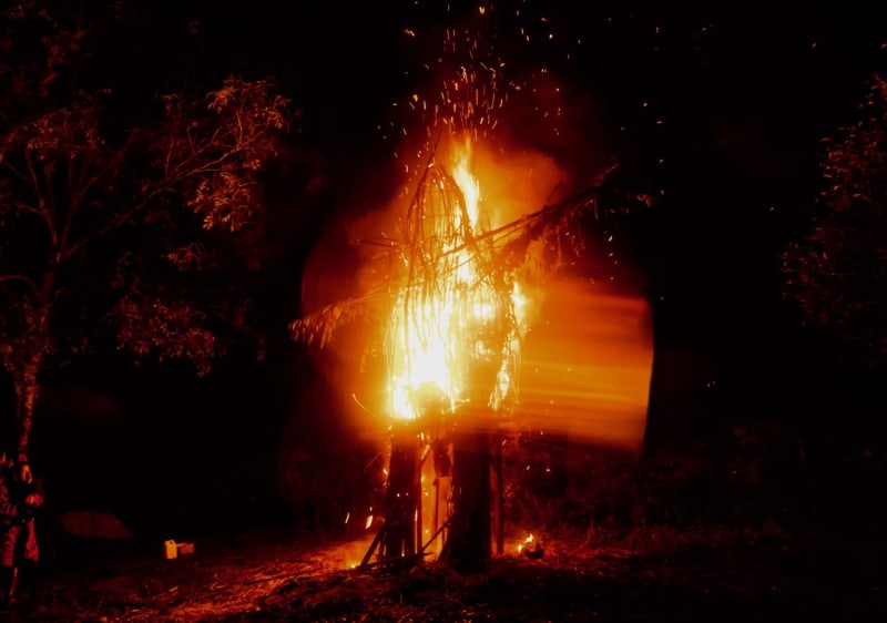 The film is of the building and burning of a 25ft Wicker Man at this year’s Summer Solstice. In Boccaccio’s Decameron seven young women and three men flee the city for the countryside to escape the plague (the Black Death), and tell stories to distract themselves from the horror. Nearly seven centuries on, a group of 20 people move from the town and the city to the countryside (Higher Spargo Farm, where the burning took place) to escape and self-isolate from the plague (Covid 19). On the Solstice a sacrificial offering of a Wicker Man with a Covid-19 head is made to the pagan nature gods of the West Country. One of the celebrants sings as the effigy burns." - Tim Shaw