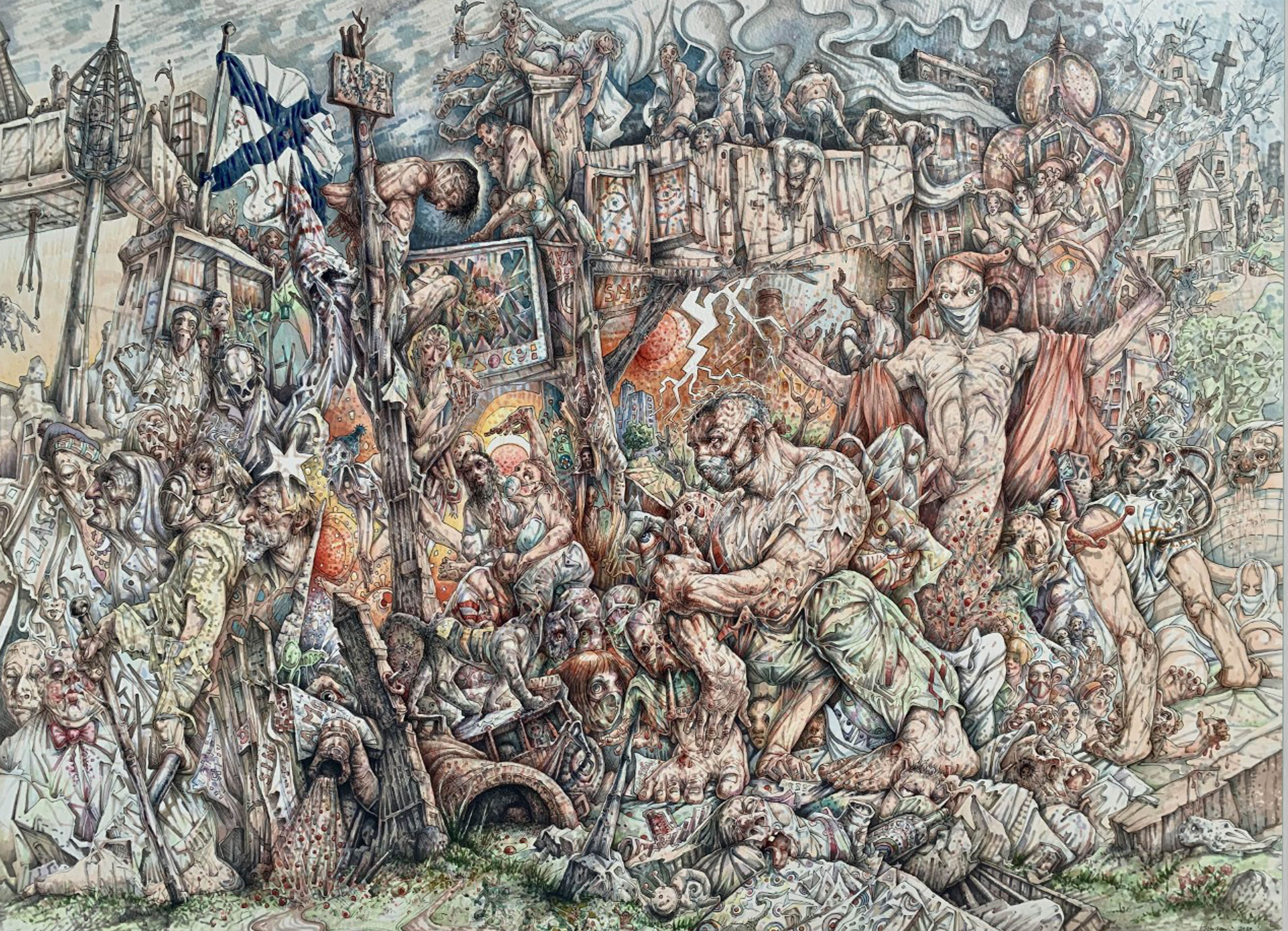 Throughout his career, Peter Howson (b. 1958) has interwoven themes of conflict and destruction, human suffering and redemption in his portrayals of contemporary British society. Strongly influenced by witnessing the brutal and personally harrowing realities of combat as an official war artist, commissioned by the Imperial War Museum, London, during the Bosnian Civil War in 1993, Howson’s paintings have since been founded on increasingly nightmarish and apocalyptic visions of chaos and atrocity, and populated by a cast of fantastic, grotesque characters. These works he now sees in some ways as predictions for what was to come. When speaking of his 2016 painting Prophecy, the subject of the 2018 film documentary by the same name, Howson has said “I saw disaster ahead – a world gone mad, riots, wars, disease and a police station not unlike Orwell’s vision in 1984".