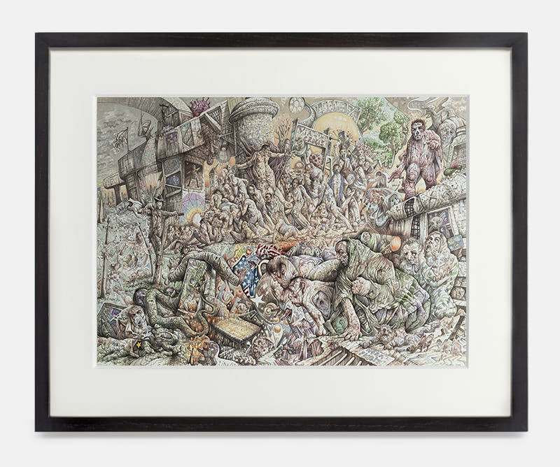 "His compositions have the feeling of Baroque ceiling frescoes. Tightly packed figures tumble into view in a jumbled mass of arms and legs against contrived backdrops of billowing clouds, twisted trees, or sinister urban architecture. The artist delights in distorting perspective, varying scale, mixing time periods, and heightening light effects—all in the service of visual narrative." - John Kohan, Peter Howson and the Harrowing of Hell, 2013