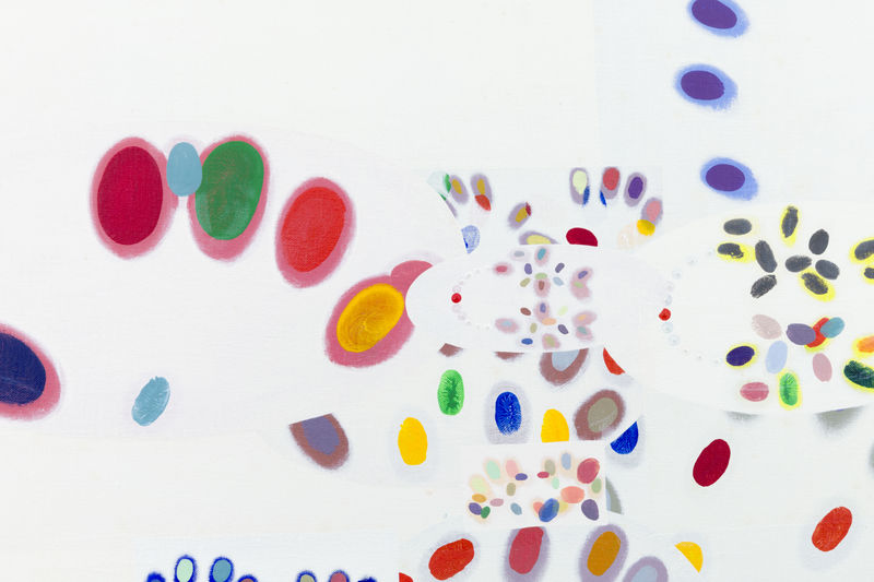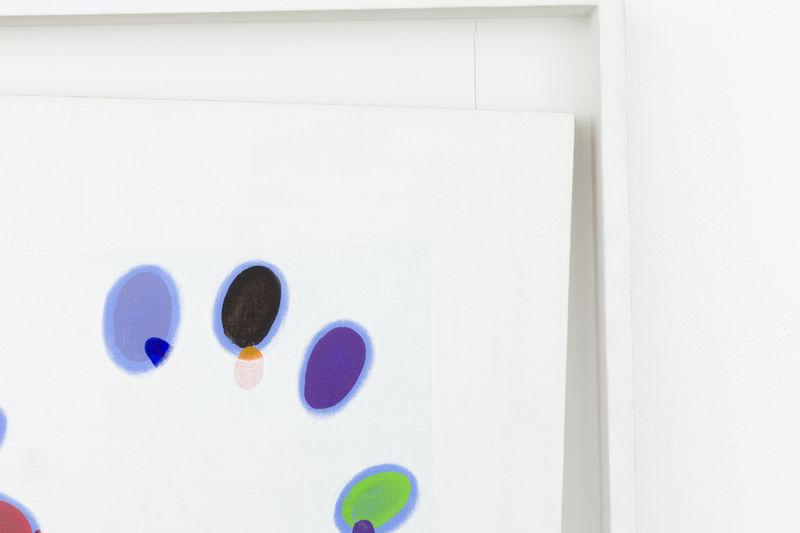 Inside Outside (1974) reflects Bernard Cohen’s ongoing exploration of spatial tension and structure as well as his predilection for situating clusters of paint within extremely exposed white canvas, a notable trend of this period for the artist. With small bursts of colour organically growing from the centre of the composition, Cohen referred to his canvases as "a series of diagrams about painting". The recurring motif of the disc obstructs any symbolic inference to be made, affirming the physical process of mark-making by use of a spray gun, with the architectural layers of discs appearing to be embedded into the white space as fragmented pigment deposits.