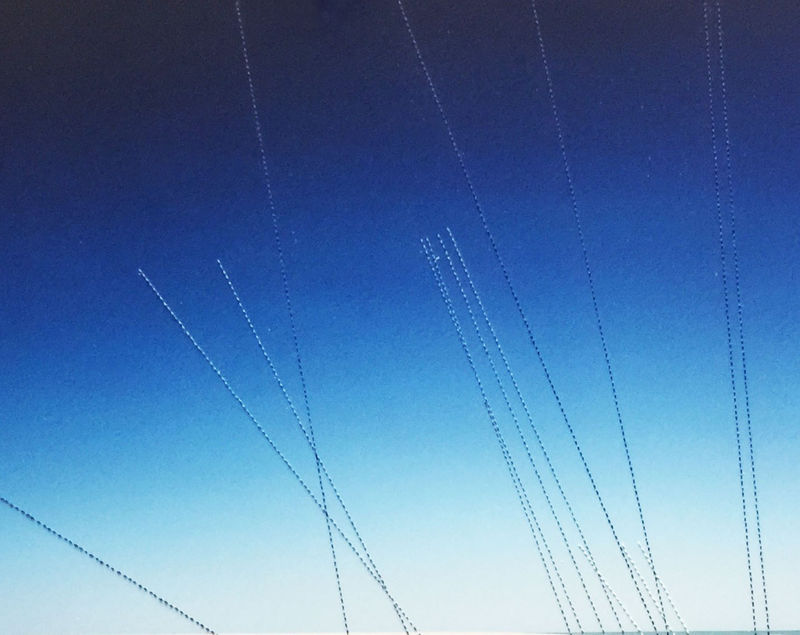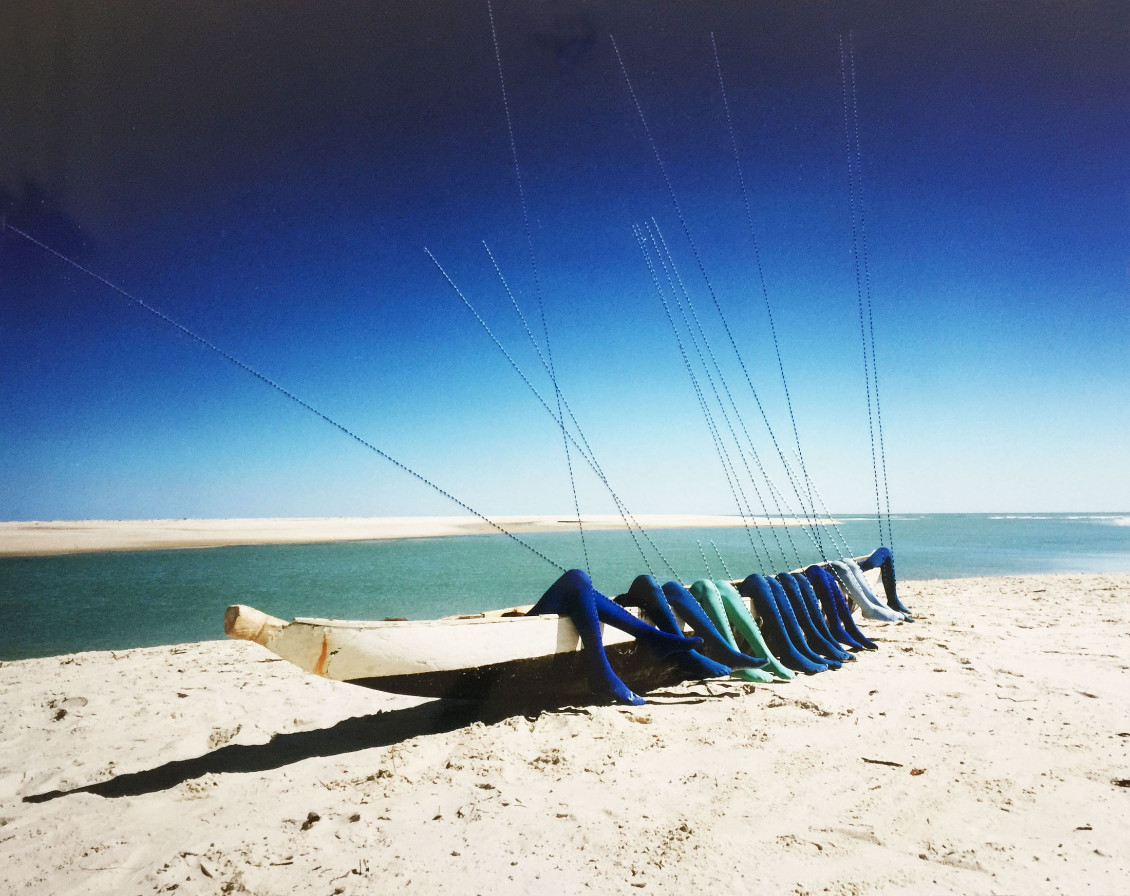 Scarlett Hooft Graafland shot Sky Lines on a beach in Madagascar, which was historically a location for the slave trade, alluding to the term "blue people", enslaved Mozambicans and their descendants, who were reclassified as "Zazamanga" (meaning "blue child") by the Merina regime after the 1877 emancipation. This reclassification was part of the regime's attempt to control and exploit formerly enslaved people, particularly those of Mozambican origin. Hooft Graafland's embroidered lines, she says, chain the women to the sky, a fantastical gesture that alludes to flight and freedom, in an unapologetically ambiguous way.