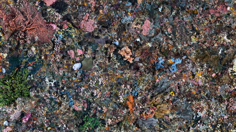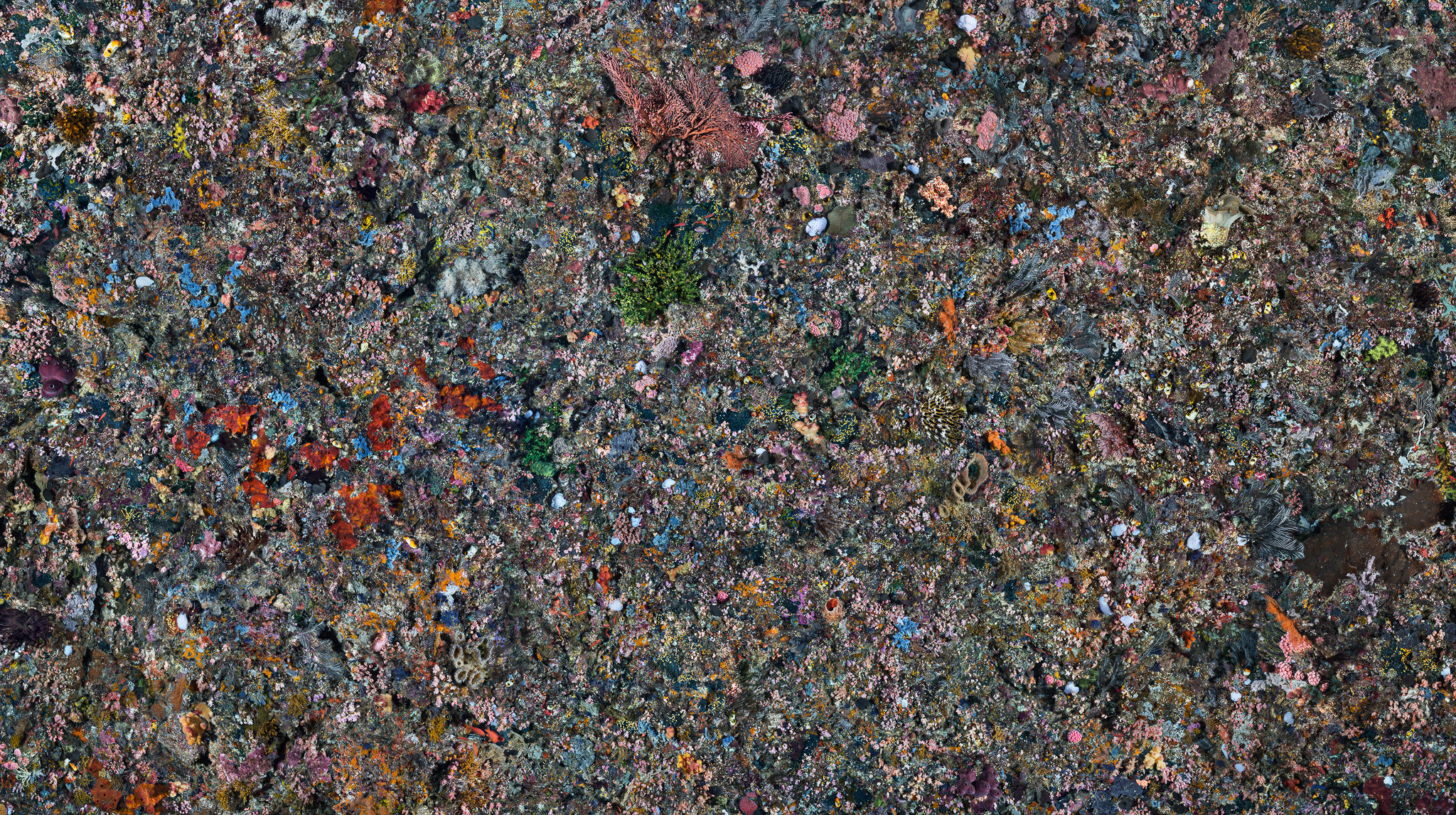 Pengah Wall #2 is an image of a coral reef roughly 60 feet deep, photographed in Komodo National Park, Indonesia, an area spectacularly rich in biodiversity. Captured underwater with a team of ten divers and composited from 160 high-resolution images, measuring a total of 200 square feet (precisely the size of the photographed area), this pristine all-over kaleidoscopic constellation offers a poignant counterpoint to images of the altered environment.