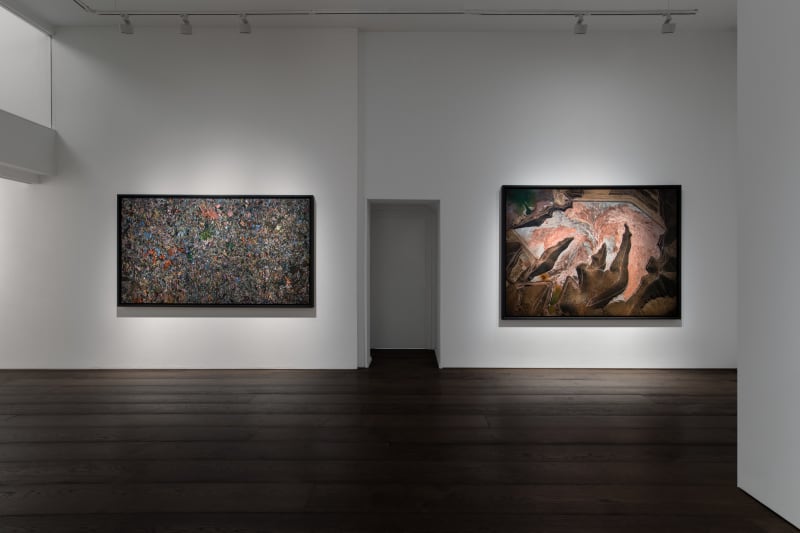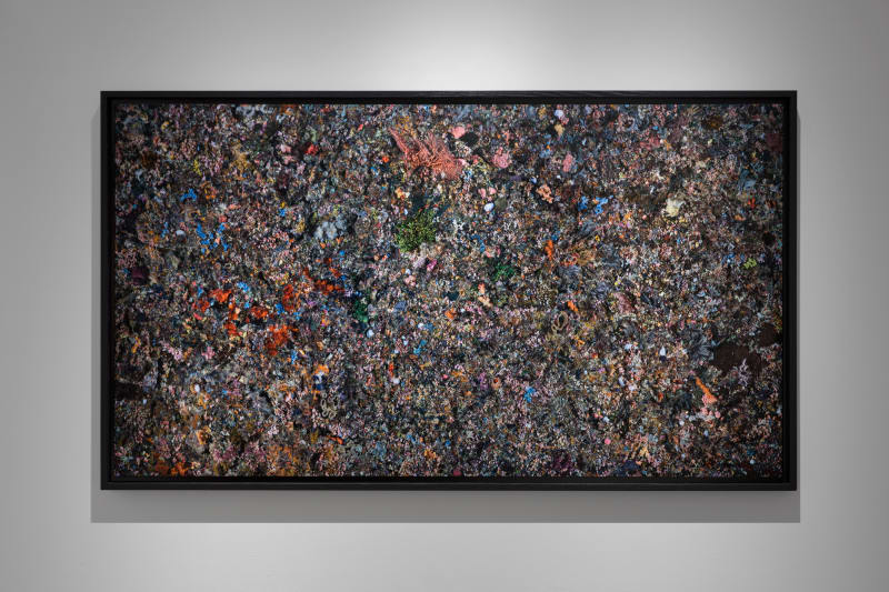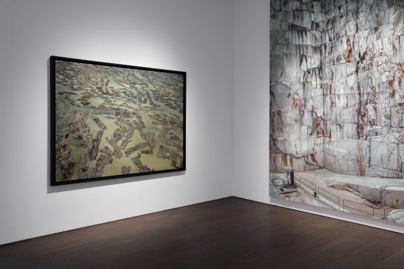Carrara Marble Quarries #2, shown in the exhibition as a large-scale wall mural, is taken from a frontal perspective of one of the most renowned marble quarries in Carrara, Italy. The mural, measuring more than six metres long, is comprised of 122 exposures, capturing the magnitude of its cubed architecture with exceptionally high-resolution detail. In contrast, Pengah Wall #2 is an image of a coral reef roughly 60 feet deep, photographed in Komodo National Park, Indonesia, an area spectacularly rich in biodiversity. Captured underwater with a team of ten divers and composited from 160 high-resolution images, measuring a total of 200 square feet (precisely the size of the photographed area), this pristine all-over kaleidoscopic constellation offers a poignant counterpoint to images of the altered environment.