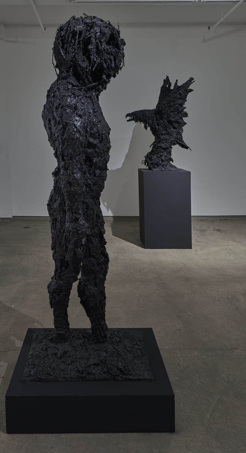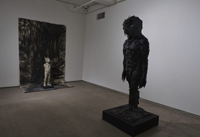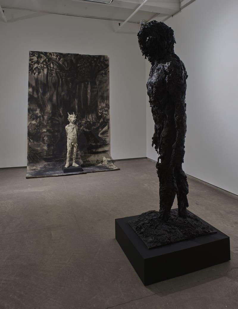 The newly-cast bronze sculpture Brave (loaned by the Yale Center for British Art), depicts the figure of a young boy, who adapts to the susceptibilities of youth by drawing his courage from the protective armour of a bearskin. Hicks continues to explore the fragile transition to adulthood in a work featuring a boyish figure with wolf’s head titled Show me a Man and I’ll Show you a Boy. The contrast between his proud, puffed out chest and diminutive frame reflects a jarring distinction between the innocence of the inner child and the culturally-driven pressures of ‘being a man’.