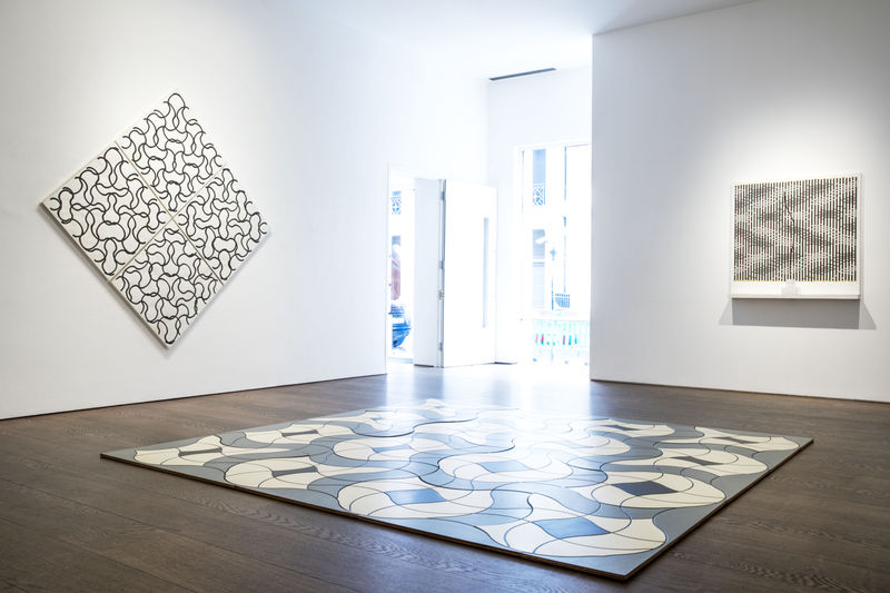 Kidner’s work of the 1980s engaged open-ended lattices and grids which, he determined, would “give the void a visible presence.” The interwoven network of looping and curling black lines in the painting Systematic Breakdown and his mixed media Floorpiece (both exhibited for the first time in the UK since the retrospective exhibition Michael Kidner: Painting, Drawing and Sculpture at the Serpentine Gallery, London in 1984), show how Kidner’s treatment of empty space could conceal what he described as a “powerful source of energy in search of an equilibrium.”