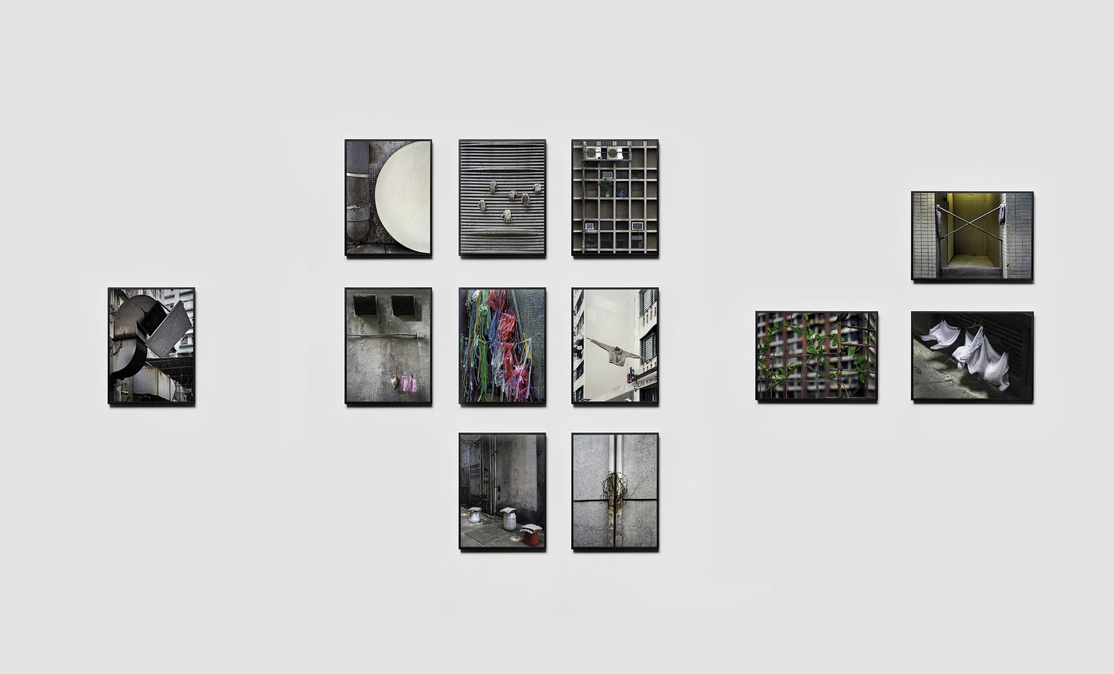 With Informal Arrangements, Wolf countered the rigid uniformity of the high-rise blocks seen in Architecture of Density, exploring the vast network of back alleys that weave around them. Situated between public and private space, these passages are utilised by the population in a multitude of ways, including acting as shortcuts between thoroughfares, as quiet resting places, or as much-needed storage spaces by local workers and residents. For Wolf, the items found in these alleys, often taking on new and improvised functions, form a valuable insight into the city's vernacular culture: upturned buckets topped with egg crates provide seating and gloves are left to dry on coat hangers, each assemblage captured as a form of urban still life. The works in this presentation explore just a few of the twenty-three categories that make up this encyclopaedic project.